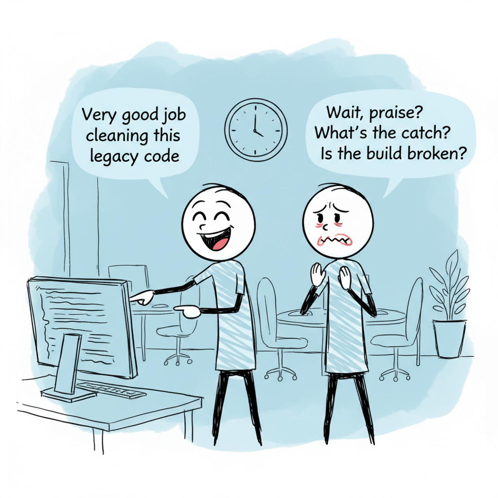 A quick “Nice! This is way cleaner” or “Great catch with this edge case!” can make someone’s day and fosters a culture where people aren’t afraid to share their work.